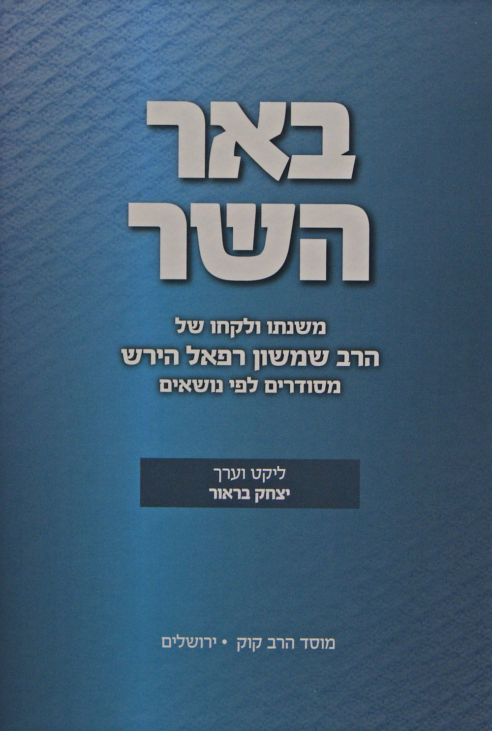 משנתו ולקחו של הרב שמשון רפאל הירש זצ"ל מלוקטים מכל ספריו וערוכים לפי נושאים. הרב שמשון רפאל הירש הוא אחד היוצרים הגדולים בתחום ההשקפה והמחשבת היהודית ומשנתו וחזונו ראויים ללימוד ולעיון מעמיק בשל האקטואליות לימינו אנו. הספר מנגיש את משנתו לקורא באמצעות ליקוט ואיסוף הרעיונות מכל כתביו שתורגמו לעברית תחת כותרים ונושאים בשפת זמנינו ולאור בעיות השעה והתקופה