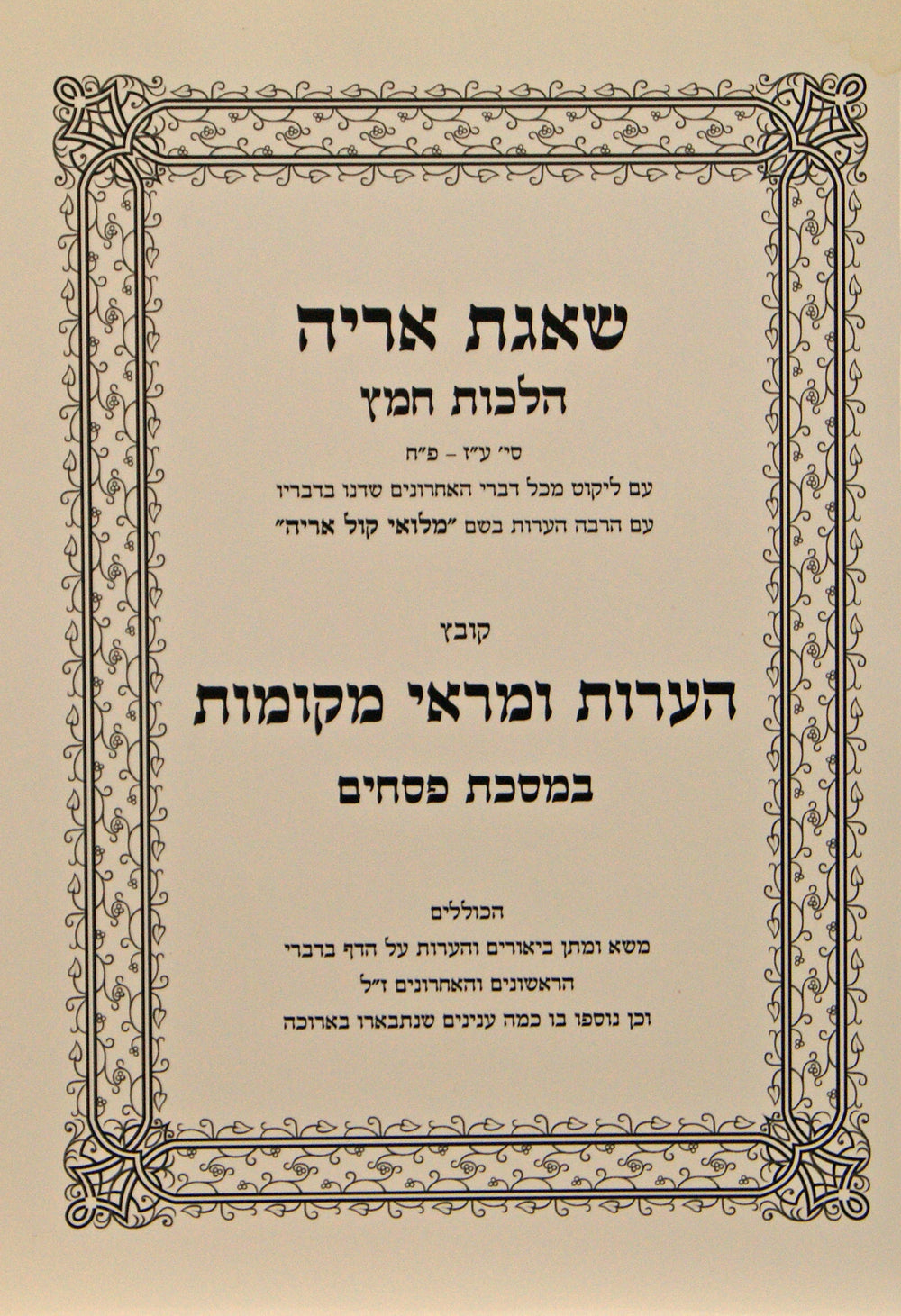 שאגת אריה הלכות חמץ סי' ע"ז – פ"ח עם ליקוט מכל דברי האחרונים שדנו בדבריו עם הרבה הערות בשם "מלואי קול אריה". הערות ומראי מקומות מס' פסחים משא ומתן, ביאורים והערות על הדף ובדברי הראשונים ואחרונים. תשס"ח