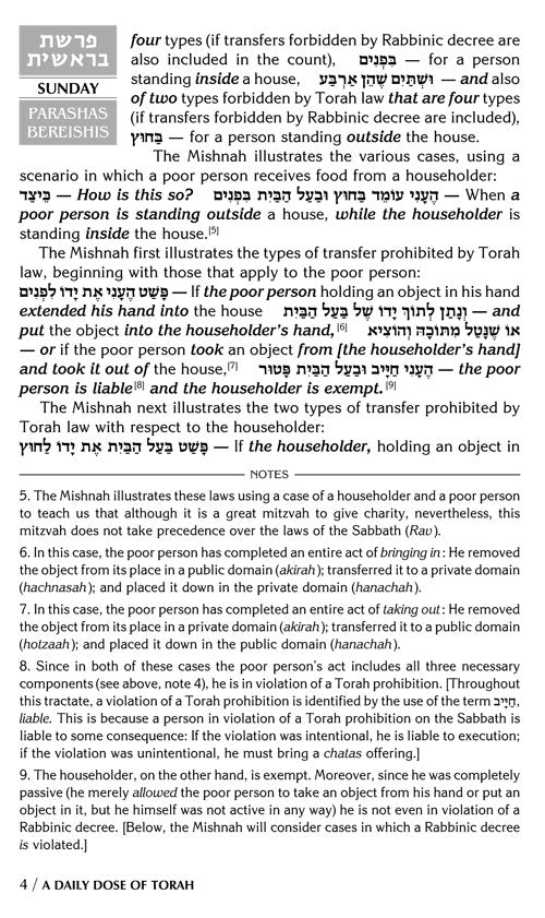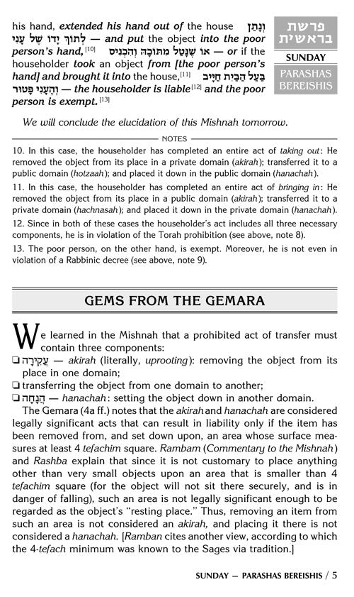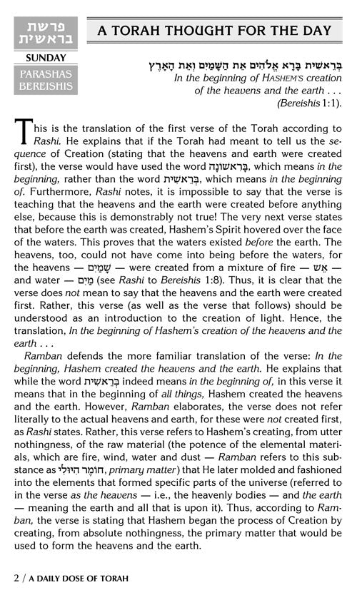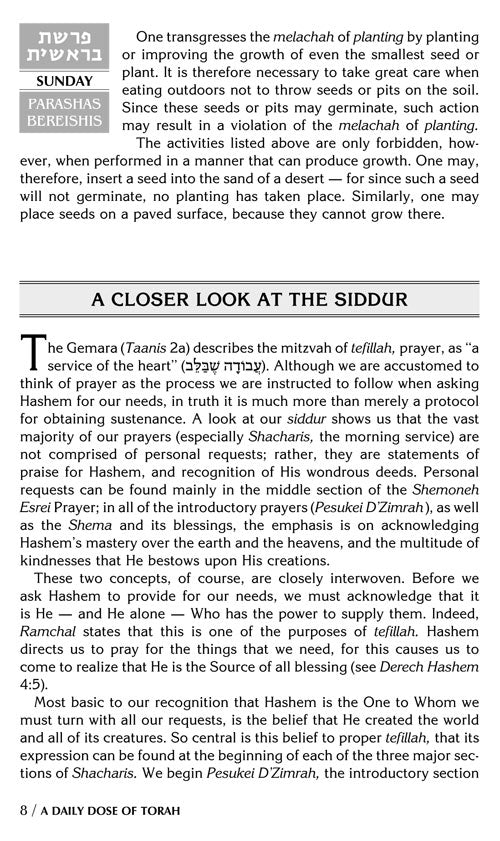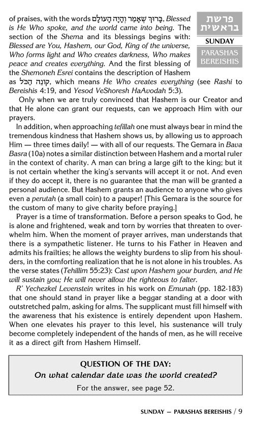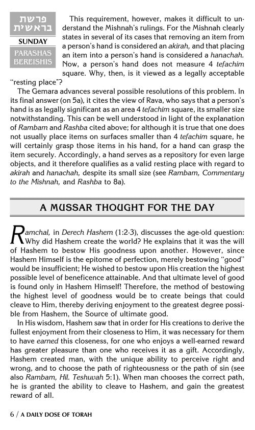This volume provides 4 weeks - that's 28 days - of provocative and enjoyable Daily Doses of Torah study, for the weeks of Bereishis through Vayeira. Each day's learning program includes: A Torah Thought for the Day, Mishnah of the Day, Gems from the Gemara, A Mussar Thought for the Day, Halachah of the Day, A Closer Look at the Siddur, Question for the Day and a Taste of Lomdus once a week.
