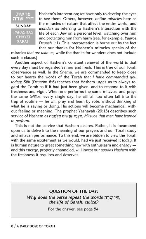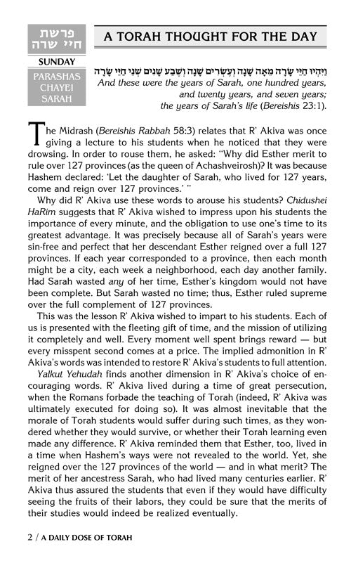 Vol. II Weeks of Chayei Sarah to Vayishlach - For people who want the stimulation of classic Torah sources every single day. Even if you have a regular learning program, A Daily Dose will add more learning and excitement to your day - every day! This 2nd volume provides another 4 weeks of provocative and enjoyable Daily Doses of Torah study, for the weeks of Chayei Sarah to Vayishlach. Each day's learning program includes: A Torah Thought for the Day, Mishnah of the Day, Gems from the Gemara, A Mussar Thought for the Day, Halachah of the Day, A Closer Look at the Siddur, Question for the Day and a Taste of Lomdus once a week.