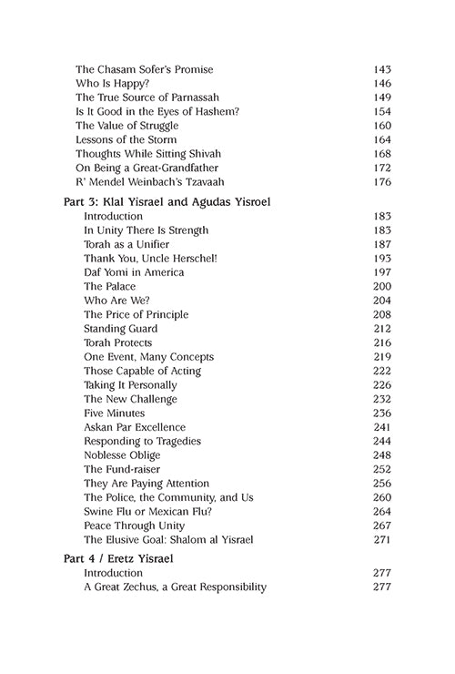 Rabbi Bloom met with gedolim at Agudah events, at meetings of the Moetzes Gedolei Torah, and in quiet, urgent conferences. He chatted with them in cars and on Shabbos afternoons at conventions. Here we will hear stories, many of them not widely known, of generations of greatness: from the Chafetz Chaim to Rav Aharon Kotler and Rav Moshe Feinstein; from the Gerrer Rebbes to Rav Aharon Leib Shteinman to Rav Don Segal -- and dozens and dozens more. In these “stories behind the stories,” we gain a unique understanding of the inner workings of daas Torah, in all its glory. We also meet the Jewish People's askanim, up close and personal. We are amazed by first-hand stories of men like Mike Tress and, of course, the incomparable Rabbi Moshe Sherer: their dedication to "Klal Yisrael and Reb Yisrael" that is, to the entire Jewish people, and to each and every member of our nation.