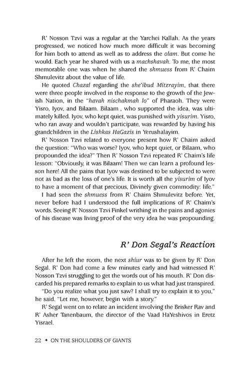 In his years in Agudah, Rabbi Bloom also met with the highest echelons of the U.S. government, and he shares his behind-the-scenes understanding of great political events and movements. On the Shoulders of Giants offers an unusual combination of Torah insights, inside stories of gedolim and askanim, and political and historical perspectives - as well as dozens of photographs. It tells the story of Torah Jewry's challenges and unbelievable resurgence. It’s our story -- our history and our future -- written by someone who was there to see it all.