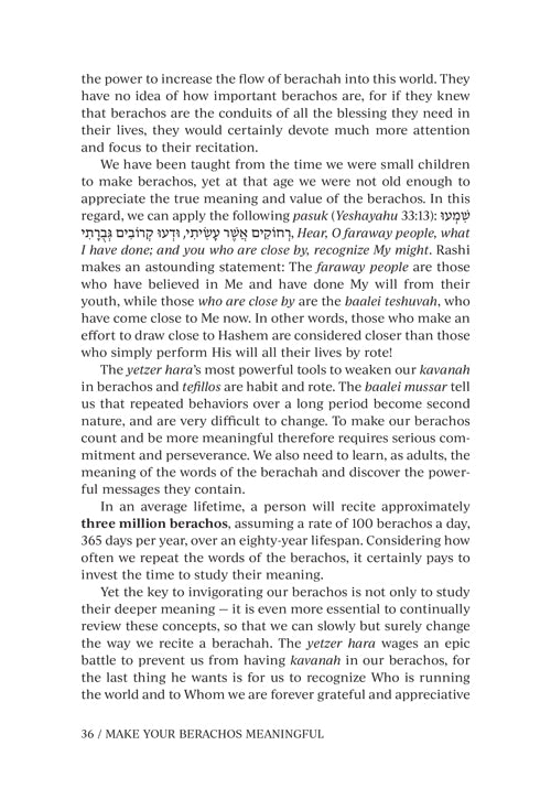 Many of us have been saying berachos since childhood -- and, unfortunately, some are still saying them with the perspective of a five-year-old. How can we begin to say berachos properly, with full intention, like mature adults? More: How can we reap the enormous benefits that Hashem has promised those who say berachos with sincere feeling?