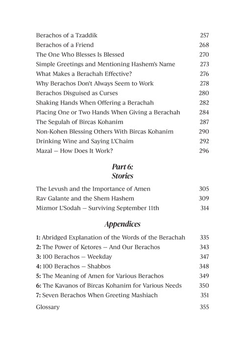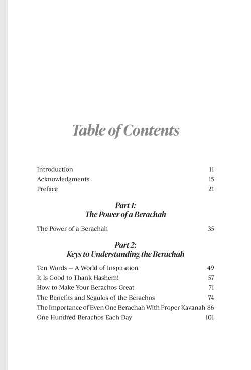 From the days of David HaMelech and onwards, Jews have discovered the power of saying 100 berachos with kavanah daily. Divided into 100 daily readings, Make Your Berachos Meaningful includes detailed commentary on the words of the berachos, practical techniques to help enhance concentration, a unique section about the power of giving and getting blessings from others and, of course, stories that help to incorporate these vital teachings into our lives.