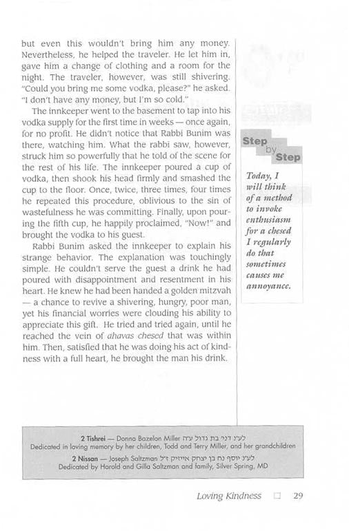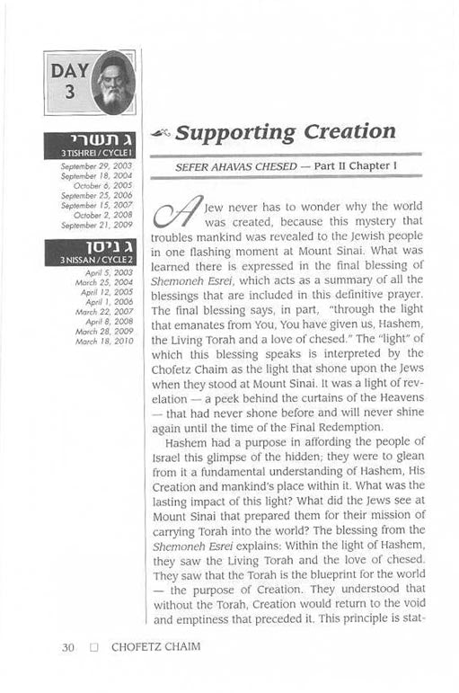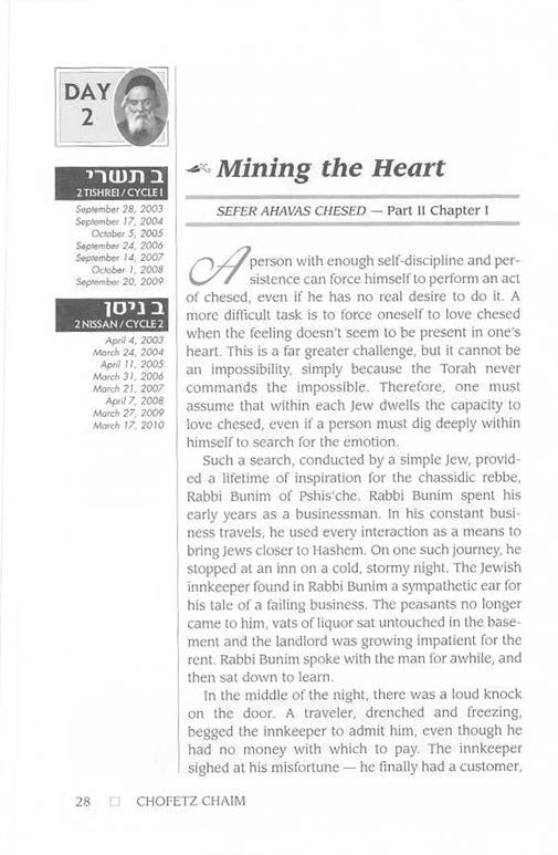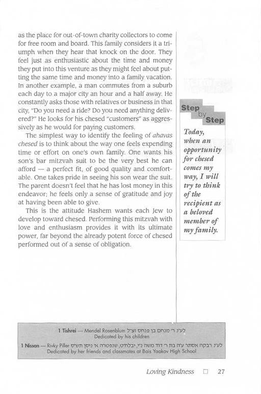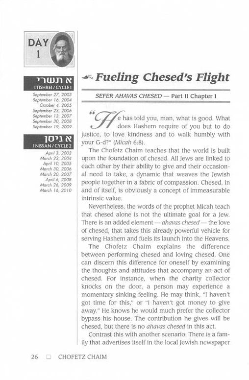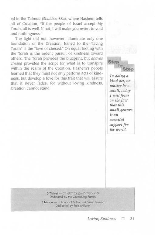 With the goal of helping every Jew develop a positive mindset toward chessed, the Chofetz Chaim probes its importance in human relationships. Demonstrating that chessed is no less than an emulation of G-dly compassion, he reveals further that it links all Jews and underlies the Jew's relationship with all Creation.