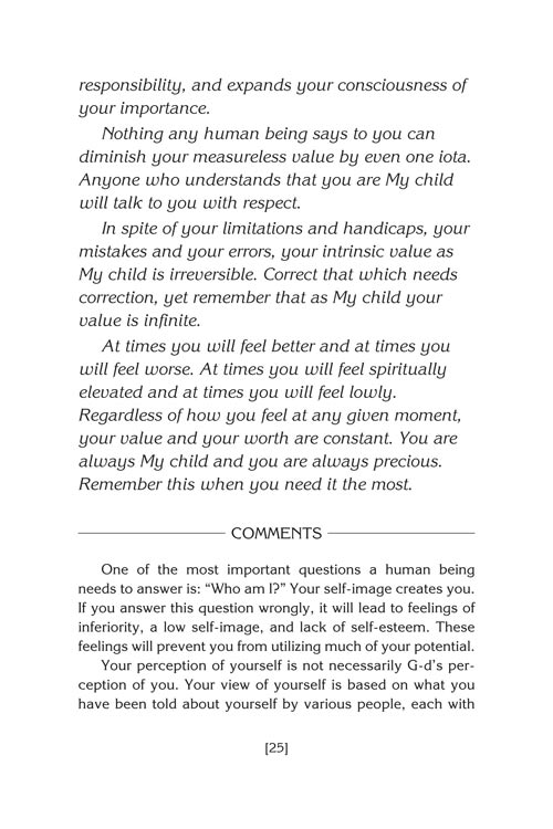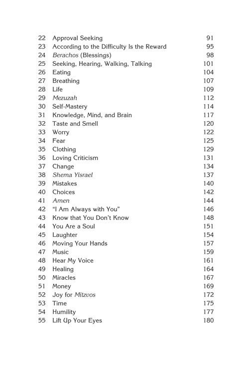 An inspiring, comprehensive overview of basic Torah principles from G–d's perspective, with insights and examples drawn from the author's extensive teaching and counseling experience. This is a book that will enlighten both the beginner and the scholar. It will help make us aware of G-d's presence to intensify spiritual experiences and elevate the mundane.