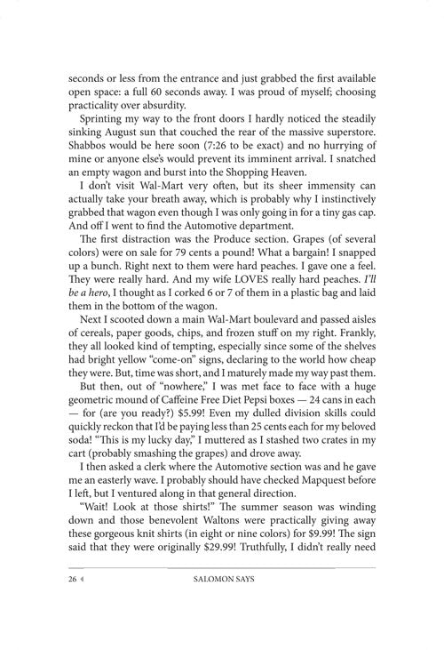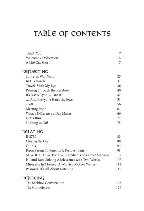This is a walk through our lives that will be fun, entertaining - and eye-opening. We'll enjoy a fresh cinnamon danish from Gross's Bakery - and learn a lesson on using our time effectively. We will revel in the five-star dining room of a Pesach hotel, and gain - no, not five pounds - but a new understanding of our priorities. In Wal-Mart we'll find, not only discounted shirts and hothouse grapes, but a lesson that will help us navigate the aisles of the superstore called Life. We will meet a man struggling with gambling who finds a novel, and moving, way to beat his addiction, and we will learn from him a lesson that will serve us all well.