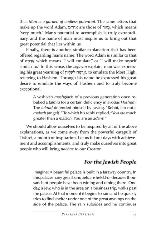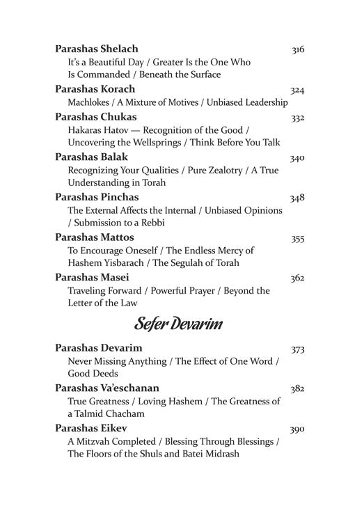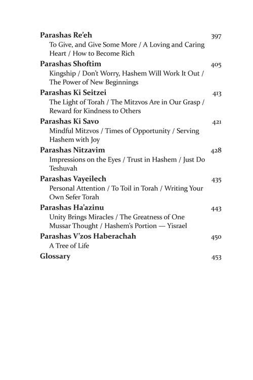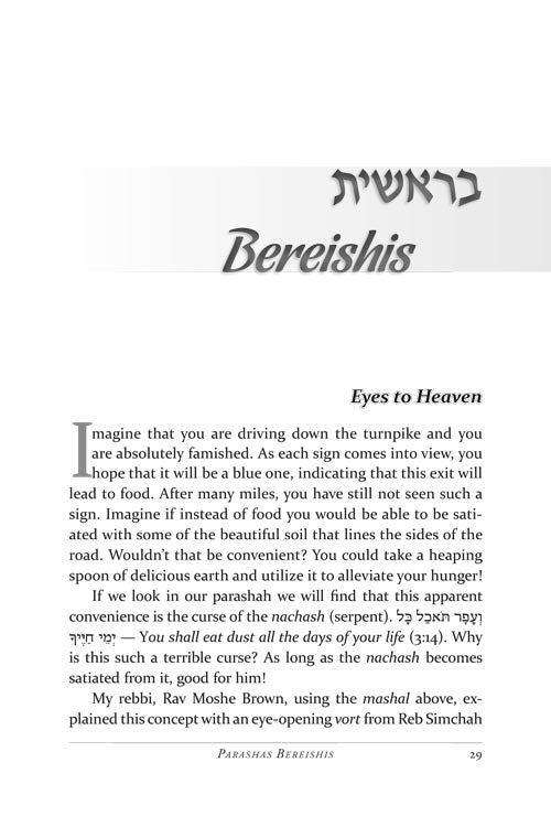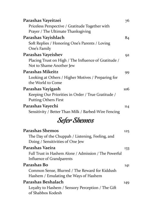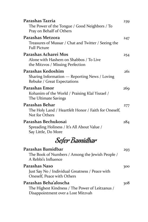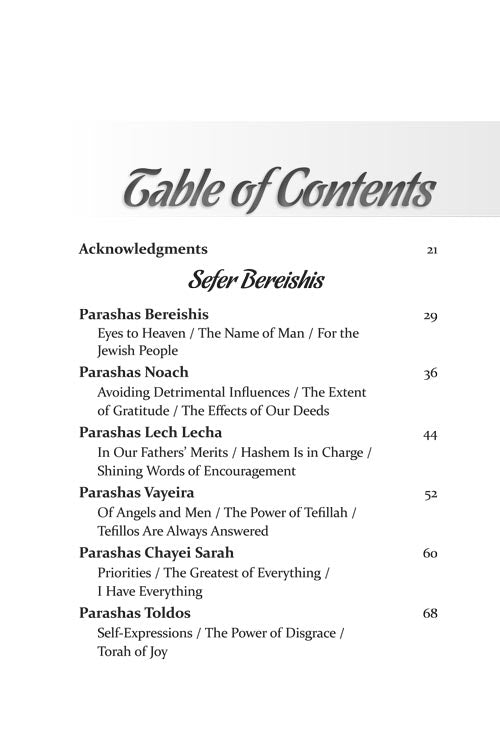 But while every word is infused with our mesorah, the stories and parables that illustrate the ideas are straight from the 21st century. Thus, we begin to understand Moshe's final encounter with Paroh - through the story of a spilled cup of coffee. A typical encounter with a school principal brings us a new insight into zechus avos, and the gift of a Rolex watch gives us a better understanding of what Shabbos should mean to us.
