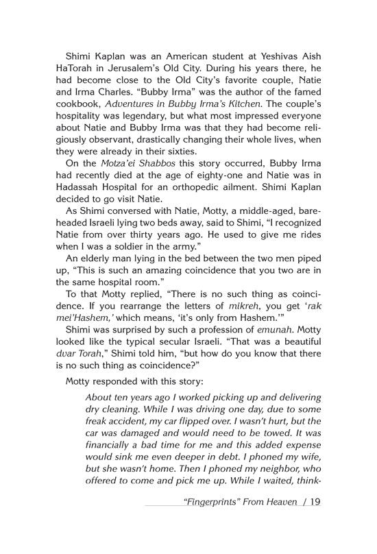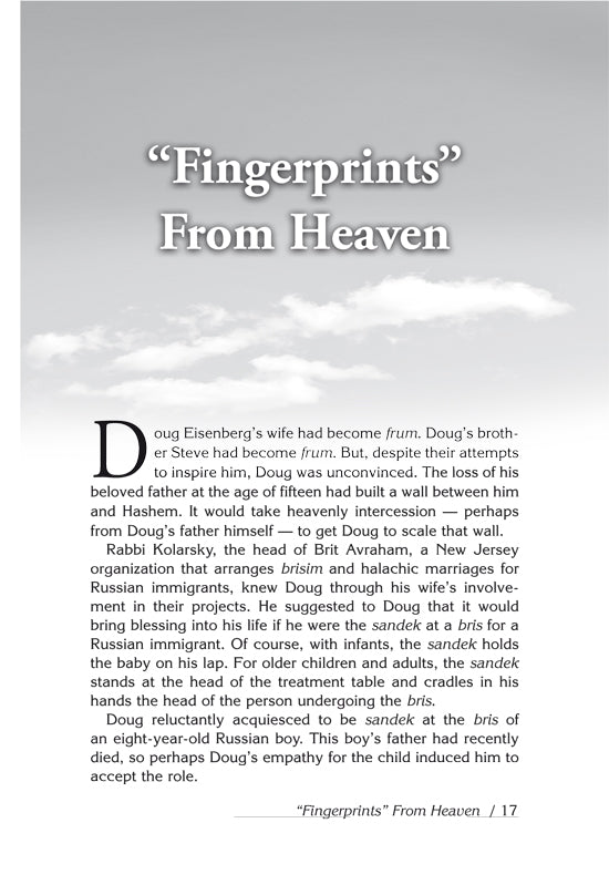 Sara Yoheved Rigler, one of the leading lights of Torah literature and the author of the bestselling biography Holy Woman, opens our eyes to Hashem’s boundless love and caring as we uncover His “heavenprints” in these unusual, captivating true stories and essays. In the Amazon jungle, the English countryside, post-revolution Iran, a tiny Caribbean island and, of course, the Western Wall, the author finds the “heavenprints” that show us how Hashem’s presence and His providence are always near us. With deep insight into both our human nature and our Divine gifts, the author gently shows us how to look for “heavenprints” in our own lives and challenges.