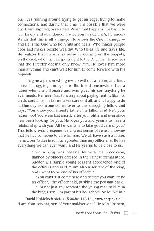 Achieving A Life of Serenity Through Faith Emunah. Live it! Living Emunah transformed the lives of tens of thousands of people, taking them on a breathtaking journey towards tranquility and happiness - through faith. Now, Living Emunah 2 brings us even further on the road to serenity. It's a priceless gift, emunah. It gives us the tools to endure tragedy and disappointment. It helps us to surmount the insurmountable, to create goals and achieve them. And, yes, it enables us to experience true happiness, the joy that comes from realizing that Hashem knows what is happening in our lives - and will only do what is best for us. With more than thirty-five thousand copies in printLiving Emunah's, short, accessible and wise daily readings have become a vital part of people's lives. In Living Emunah 2 we discover still more ways to make emunah a part of our daily life. We see how emunah can change our response to something as small as a traffic jam on a busy day, or as great as a major life challenge. We all sometimes have questions. Why weren't my heartfelt prayers answered? If Hashem loves us, why is there so much suffering? If I have emunah, can I still cry in pain? In stories, parables and, of course, in the words of our sages and Torah leaders, Living Emunah 2 helps us find the answers. In our ultra-hyped world, we are offered so many pathways to happiness that lead to dead ends. But with emunah in our lives, we can move forward on the road to joy, knowing that Hashem is with us every step of the way.