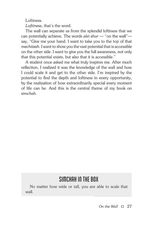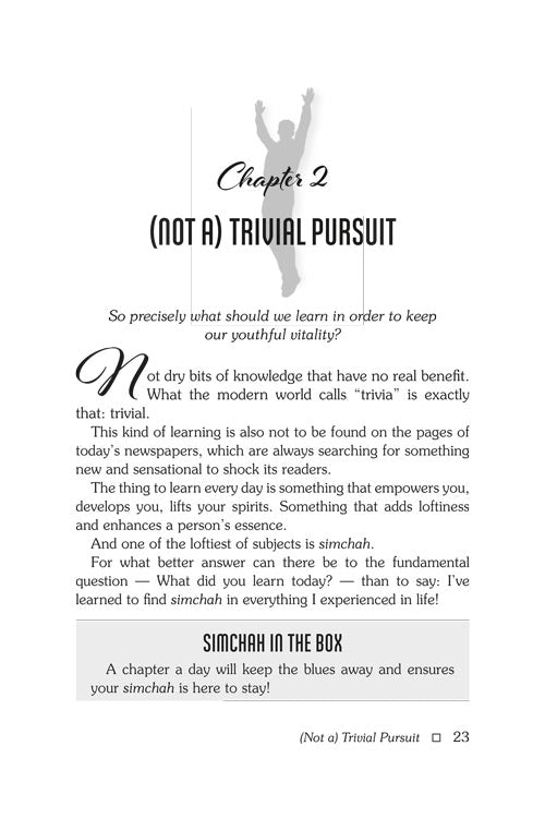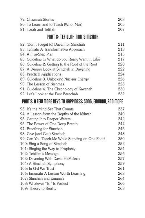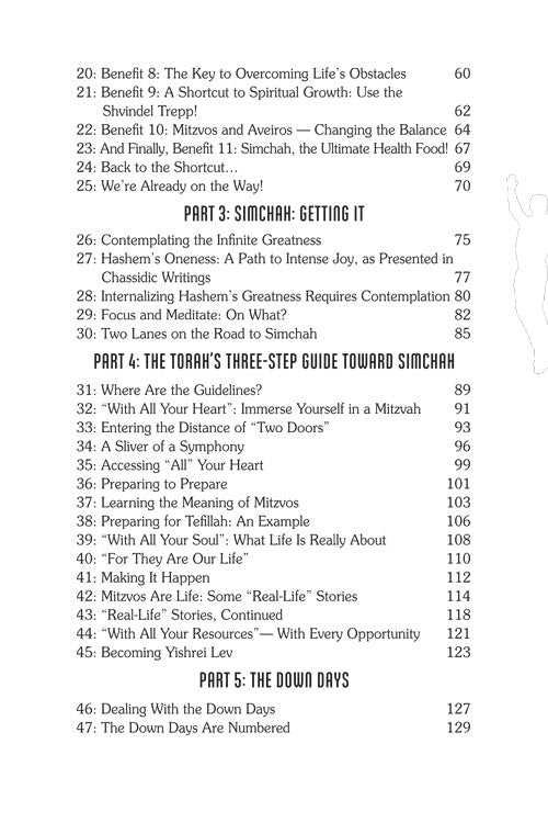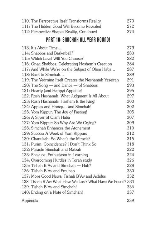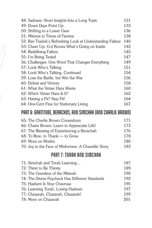 These brief segments contain so much: Torah hashkafah, quotations from classic works of Mussar, Chassidic writings, and Jewish thought, true-life stories, practical advice and, yes, jokes and quips to keep us smiling as we journey to true simchah.