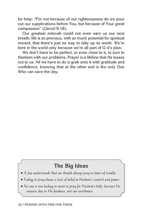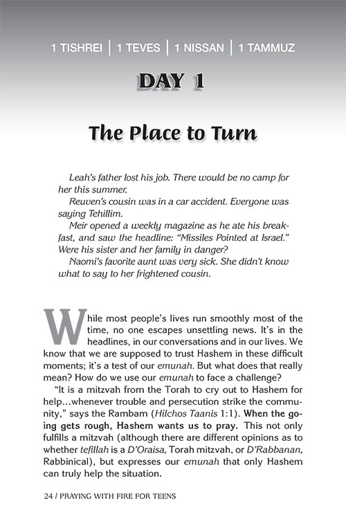 With its short, relatable daily readings, stories to illustrate every point, and brief summaries at the end of each reading, Praying With Fire for Teens shows teenagers (their parents, too!) how to pray effectively, with focus, concentration, and optimism, so that we get the most out of the fantastic gift Hashem has given us - the gift of prayer.