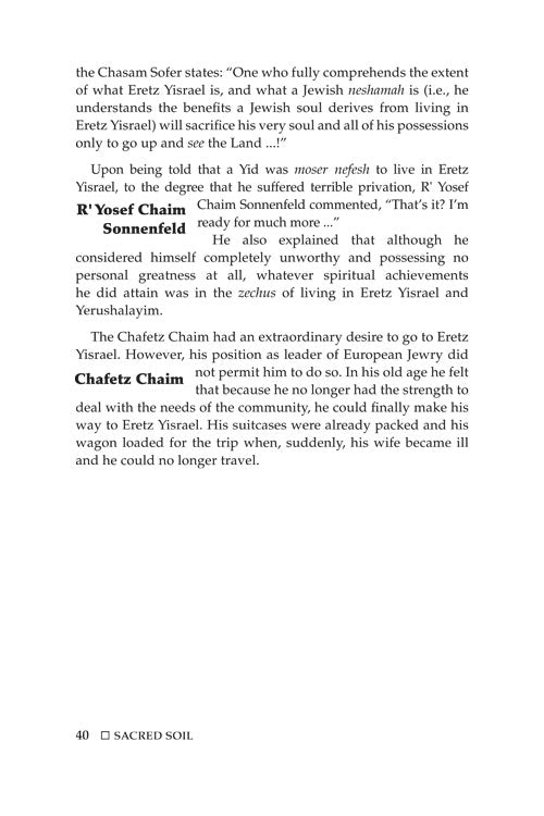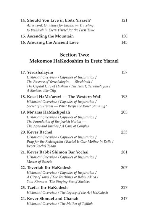 Whether you are traveling to Eretz Yisrael for a short trip, a year - or even a lifetime - make sure to pack Sacred Soil with you, to ensure that you understand, and feel, the kedushah of this land that is like no other.