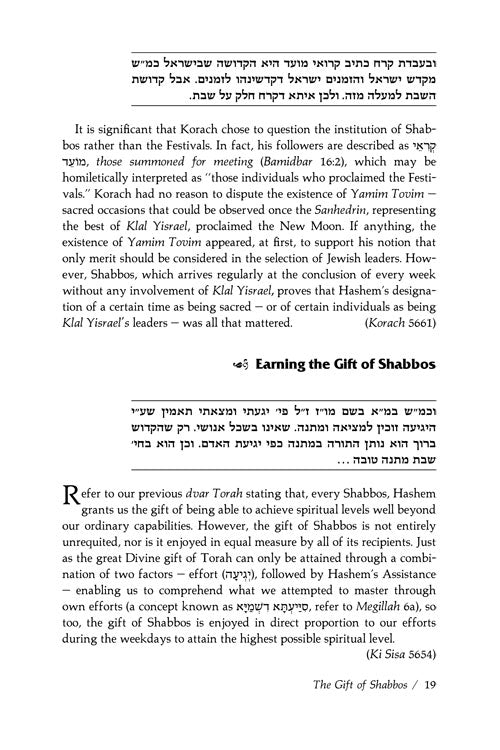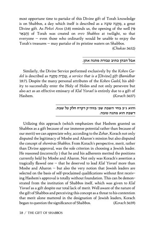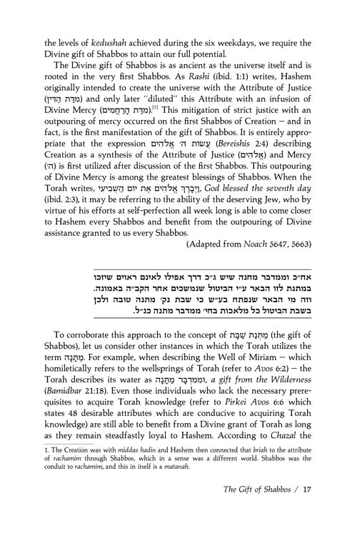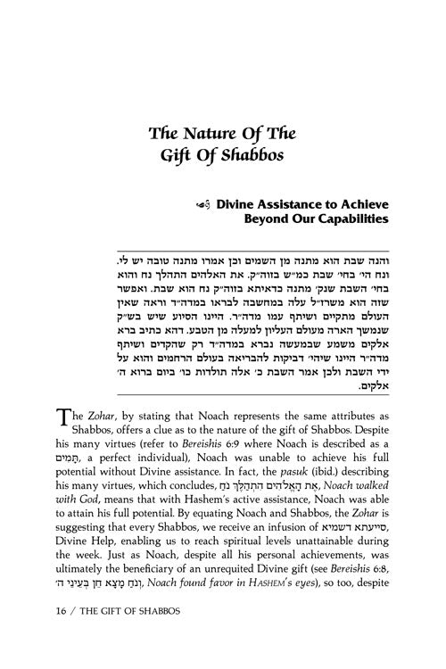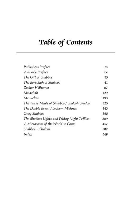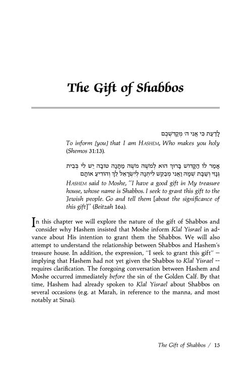 The Gift of Shabbos is a clear and brilliant work. Among the topics it explores are: ■ Melachah (creative work) ■ Menuchah (rest) ■ Shabbos as a Divine gift ■ the three meals ■ Lechem Mishneh (the two loaves of bread) ■ Oneg (delight) Shabbos ■Shabbos as a microcosm of the World to Come ■ a commentary on the Kabbalas Shabbos service.