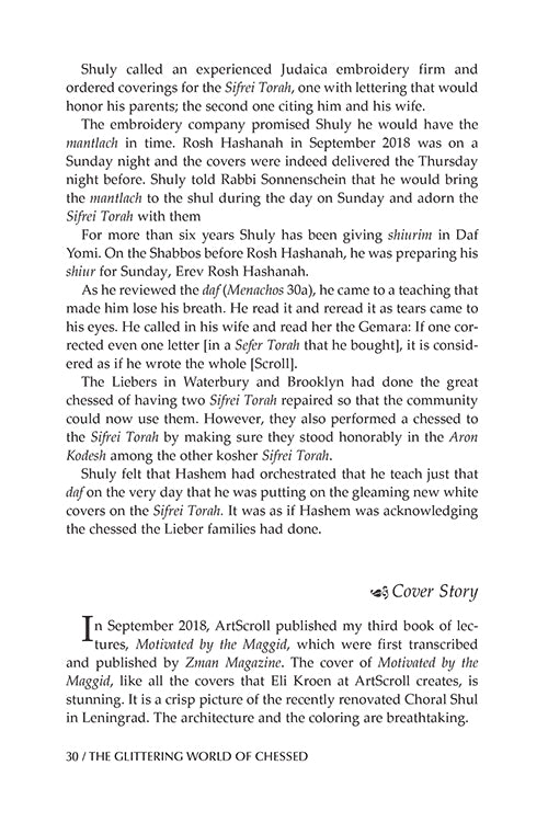 Rabbi Paysach Krohn, the globe-trotting "American Maggid," has given us so much wisdom, inspiration, and encouragement in his bestselling books. He now shares with us stories of individuals and organizations that see a need -- and step up to fill it. The Glittering World of Chessed also offers us practical advice on how each of us can amp up our own chessed - whether we are hosting guests, visiting the sick, dealing with "simchah overload" or simply listening to a friend who needs a little comfort.