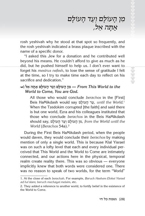 In this volume, for the first time ever in English, Rabbi Yisroel Besser gives us a whole new understanding of the magnificent words of Nishmas, with a sweeping, fresh and contemporary commentary, chock full of enlightening stories and insights that illustrate the many concepts discussed in Nishmas.