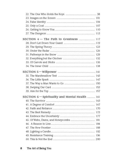 Drawing from true stories, Torah insights from Jewish sages, professional therapeutic guidance, engaging black and white illustrations, and daily exercises tailored to be practical, accessible, and relatable The Art of Being You is a guide that leads us towards a contented, satisfying, and more meaningful life.
