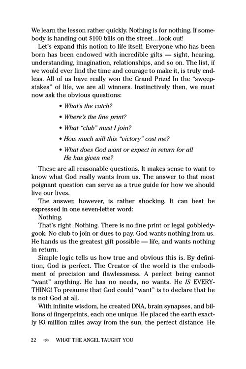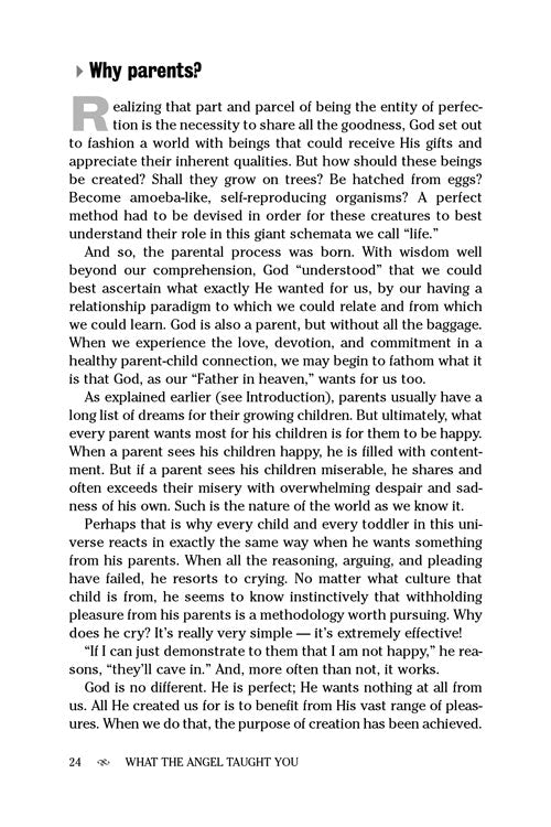 Have you ever asked, "What does God really want from me?" In their new ground-breaking book, "What the Angel Taught You; Seven Keys to Life Fulfillment," two world-renowned educators collaborate to ask and answer some of the most compelling questions we all seem to have. What does God really want from me? What is the highest class of pleasure in this world? How do I get my prayers answered? How do I know if my decisions are right? What is the definition of love? Are there any absolute truths on Earth? How does free will bring me happiness? Why was Man created? Rabbi Noah Weinberg, Founder and Dean of Yeshivas Aish Hatorah in Jerusalem, has been a distinguished educator of tens of thousands of students for over four decades and was one of the originators of today's global Kiruv movement. In this - his first book - he shares his astute and lively approach to living, and teaches us how to get genuine fulfillment out of life. Yaakov Salomon, C.S.W. is a prominent psychotherapist and accomplished author, who weaves Rabbi Weinberg's concepts into a user-friendly tapestry of step-by-step instructions toward realizing this goal. Together they have articulated a fresh and clear manual, transmitting penetrating insights in simple and invigorating terms. The result is a new approach to pleasure, prayer, free will, happiness, knowledge, love, and intellectualism that will leave you smiling, nodding, and totally inspired.