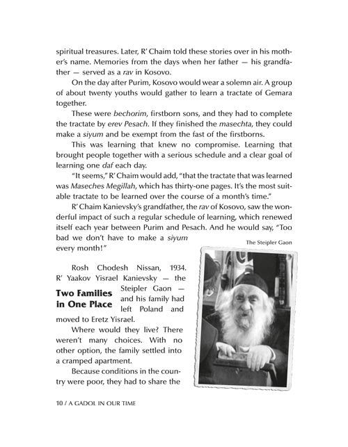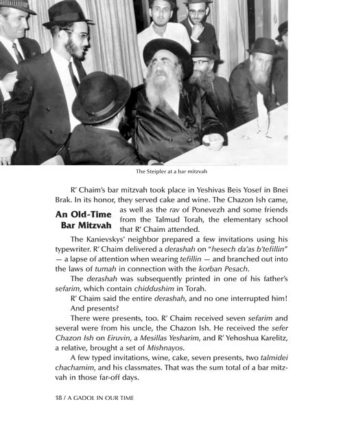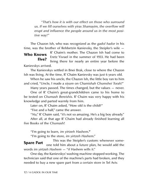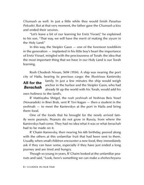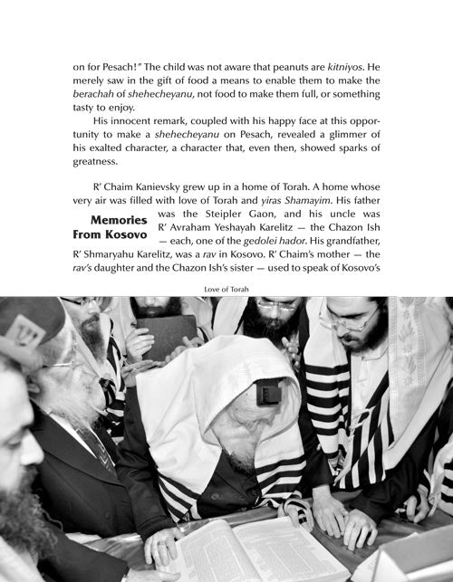 With more than 100 photographs and hundreds of stories, A Gadol in Our Time: Stories about Rav Chaim Kanievsky takes you on an unforgettable journey right into Rav Chaim's famous apartment in Bnei Brak.