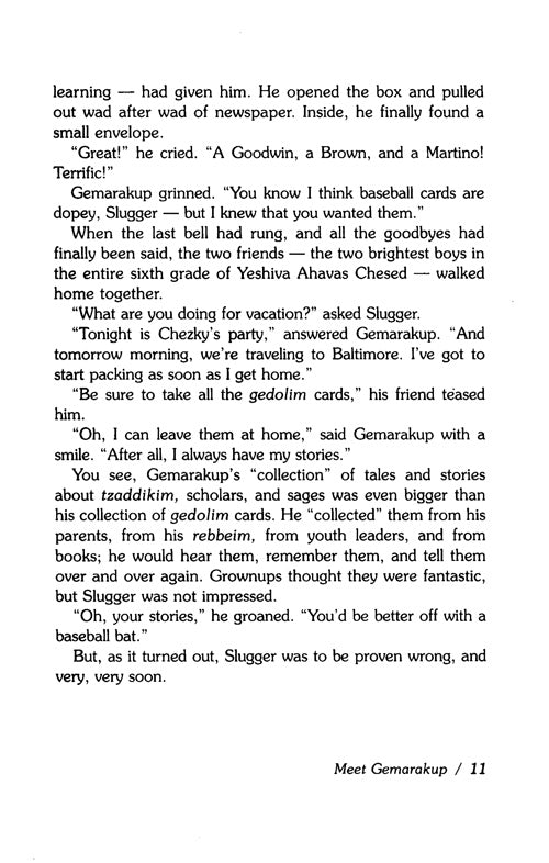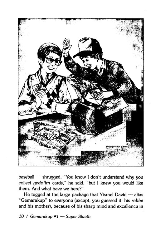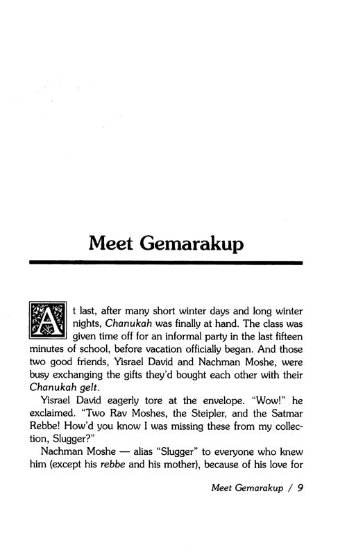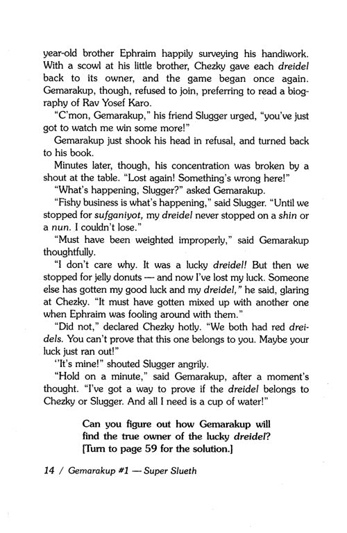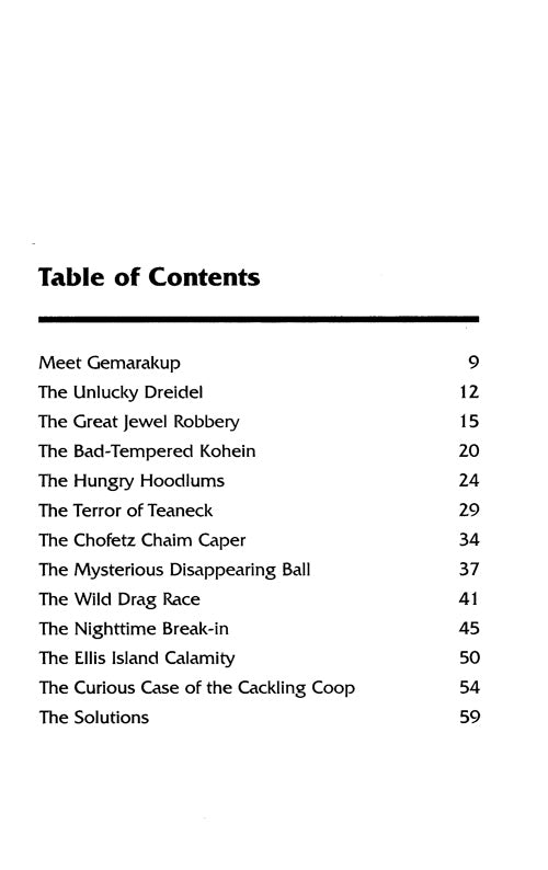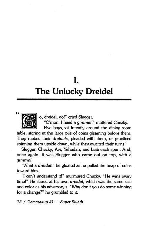Yisrael David Finkel is a sixth-grader whose friends call him Gemarakup (Talmudic mind) the police call him Sherlock Holmes because of his knack for solving mysteries using stories from our sages. Join him, and try to solve a few yourself!