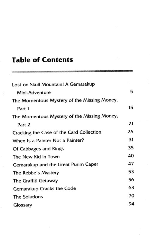 Yisrael David Finkel is a sixth-grader whose friends call him Gemarakup (Talmudic mind) the police call him Sherlock Holmes because of his knack for solving mysteries using stories from our sages. Join him, and try to solve a few yourself!