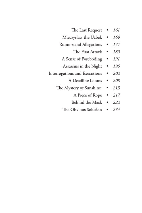 There are many twists and turns as the exciting story unfolds. The count's granaries are burned under cover of darkness. An apostate priest meets with a sinister figure among the gravestones in the churchyard. A Turkish spy is captured, but before he can be interrogated, he dies under suspicious circumstances. Assassins penetrate Bernowiecz Castle when they learn that a Polish national hero will be spending the night.