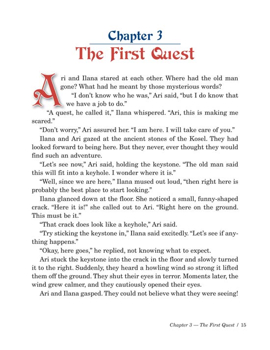 A quiet family vacation in Jerusalem turns into high adventure as Ilana and Ari Goldreich set out on an unforgettable quest through time. Sent on this mission by a mysterious man in white, and pursued by an evil man in purple, they must face danger - and learn lessons of friendship, courage, and other Jewish values - in order to save the world from deadly peril!