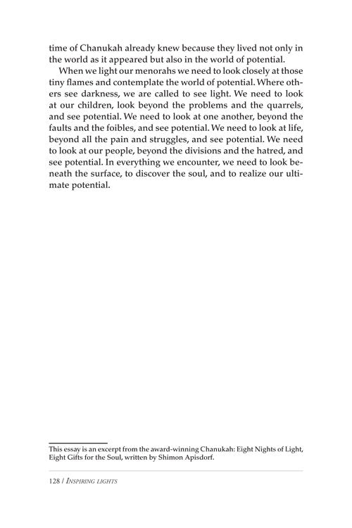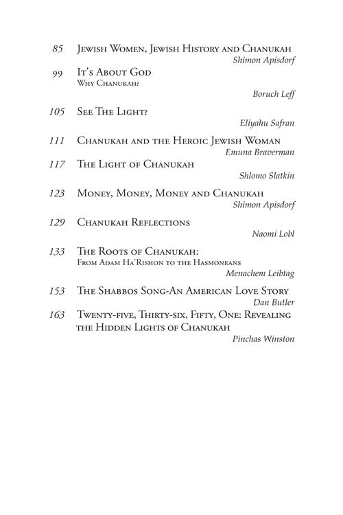 Celebrating a vision of life as illuminated by the lights of Chanukah and all that they represent In these pages you will certainly find not only fresh insight and inspiration for your Chanukah celebration, but for all of Jewish life.