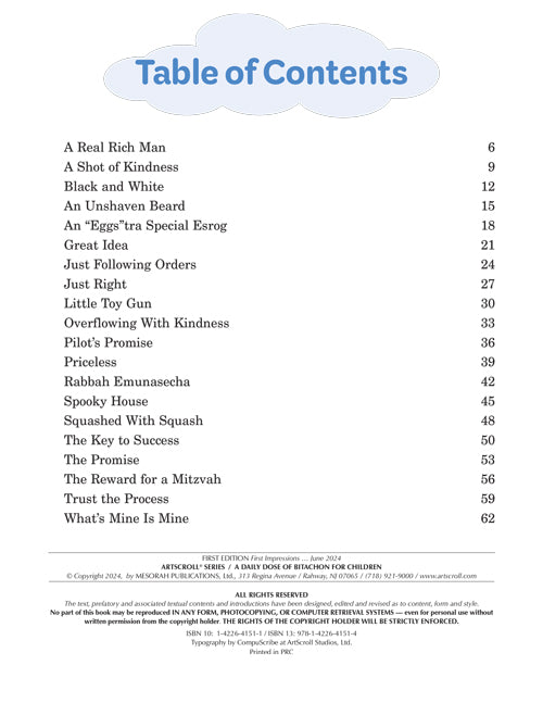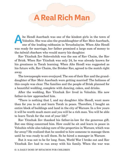 Bitachon, trust in Hashem, knowing that He loves us and that everything He does is for our benefit, is the foundation of our lives. Now, we can make it the foundation of our children's lives as well. Through engaging stories and lively illustrations, A Daily Dose of Bitachon for Children shows our children how much Hashem loves them, and how everything that happens is for their own good: lessons they are never too young to learn and which will stay with them for a lifetime!