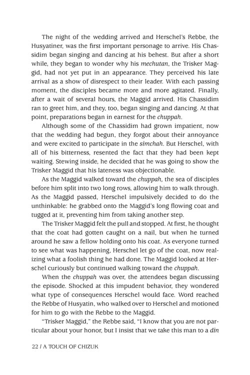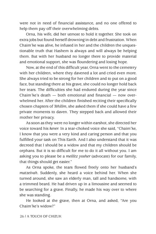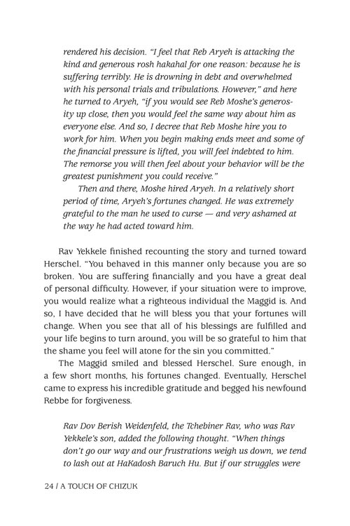 Through his beloved and bestselling collections of true stories, Rabbi Yechiel Spero has "given chizuk" to tens of thousands of devoted readers. In A Touch of Chizuk he shares more unique and fascinating stories, together with his penetrating and insightful comments. These stories will entertain and elevate us, touch our hearts and minds. And, yes, give us a much-needed dose of chizuk.