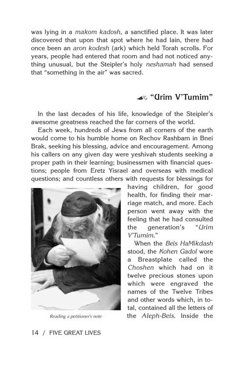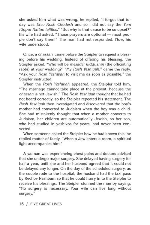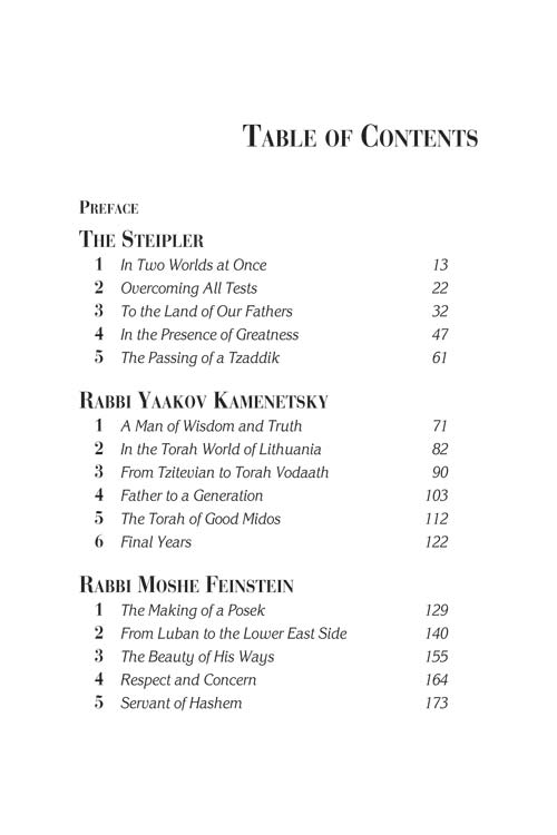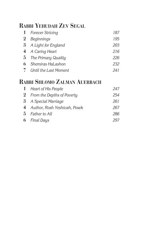 Rabbi Shimon Finkelman knows how to present the many facets of their lives as geonim, teachers, humane guides, and devout servants of Hashem. His full-length anecdotal biographies have won the admiration and gratitude of thousands. Here he presents the biographies of five venerable and beloved leaders, distilling the highlights of their lives and accomplishments. Filled with anecdotes, personal insights, and descriptions of their deeds and ideals, this book cannot fail to touch and inspire readers of all ages.