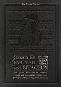 The Chazon Ish's Sefer Emunah U'bitachon has always been regarded by the Torah world with a certain sense of reverence. The immense stature of its author, the profundity of its messages, and the magnificence of its language all contribute to the unique respect accorded to this sefer. In it, the Chazon Ish outlines the prerequisite for emunah, the definition of bitachon, the proper approach to mussar, and many other fundamental concepts.