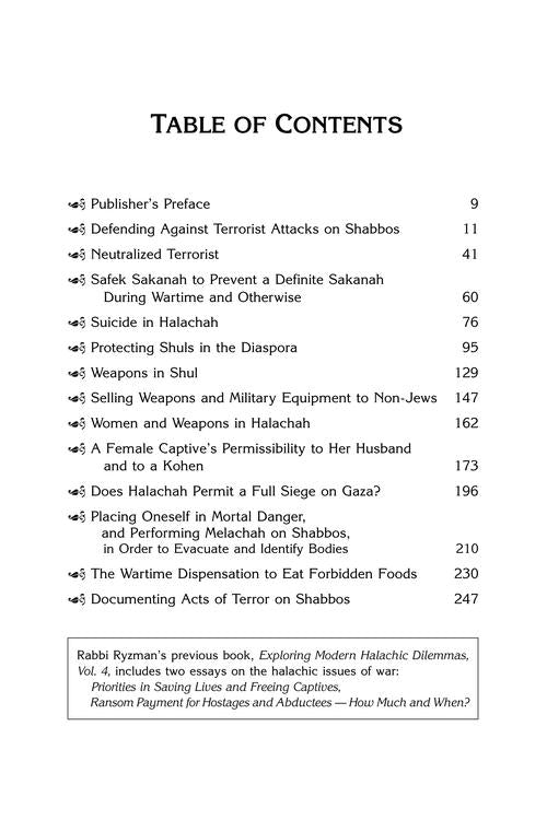 Discussions of Issues in our Perilous Times Based on Shiurim in Sefer Ratz K'Zvi As Israel battles enemies on several fronts in the wake of the October 7th massacre, and Jews in the Diaspora face an upsurge of anti-Semitism and attacks, Rabbi Ryzman turns his scholarship to these issues. He researches, analyzes, and elucidates. And when he's finished, we have a clear understanding of the topic and an understanding of the various halachic approaches. May congregants bring firearms into shul? Should soldiers risk their lives to retrieve the bodies of dead comrades? May one take a picture of a terrorist on Shabbos? May the Shabbos be desecrated if there is only a slight suspicion of a terror attack? Rav Ryzman is a scholar, teacher, lecturer, author, and philanthropist. He is a winner of the Jerusalem Prize for his many Hebrew volumes of Ratz KaTzvi. His halachah shiurim in Israel and America are attended and acclaimed by renowned rabbinic leaders. He has a fertile mind, is an original thinker and has a passion to share his brilliance with others, through the written and spoken word. In this timely new volume, he sheds light on halachic issues behind the headlines. Pages: 274 - Dimensions: 6" x 9"