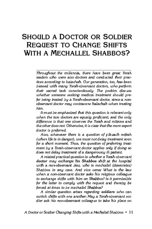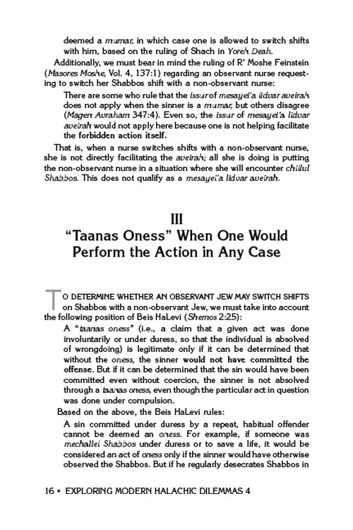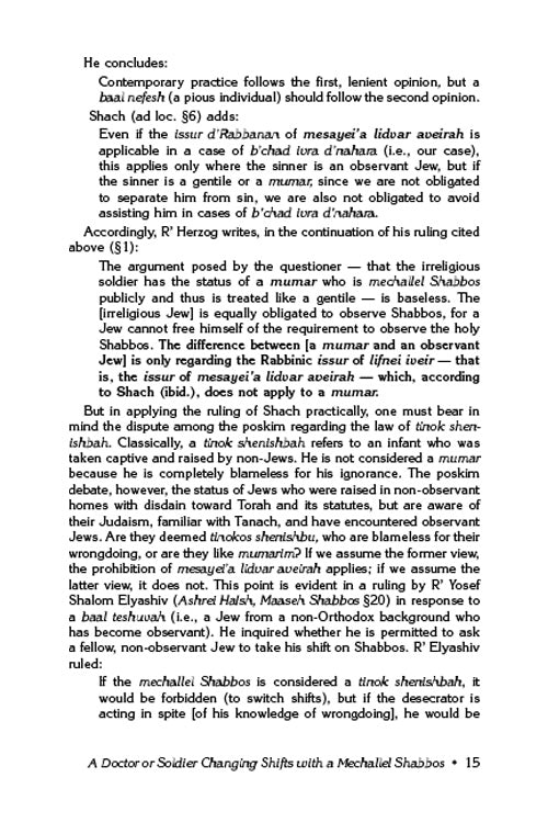 Among the other fascinating topics in this volume: May a Shabbos observer trade shifts with a non-observant Jew? May one schedule elective surgery a few days before Shabbos? May one desecrate Shabbos to help a person in emotional distress? And there are many more. Rabbi Ryzman researches, analyzes, and explains. He is not only a great scholar, he is a master teacher. When he’s finished, we have a clear understanding of the issues and of how the author and the great poskim apply classic principles to current dilemmas.