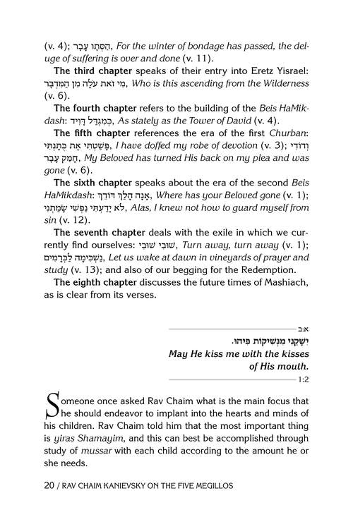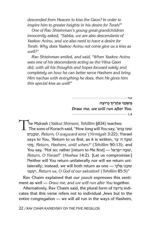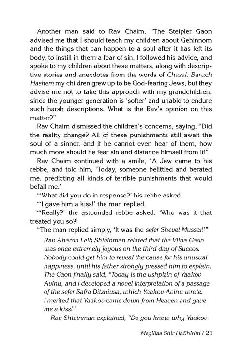 Rav Chaim on the Five Megillos shows once again how the Sar HaTorah sees insights and provides interpretations that are uniquely his. This is a sefer to learn, savor, and treasure. The Talmud says that Yaakov Avinu did not die, because his offspring, teachings and Torah survive. In this most meaningful sense, Rav Chaim is still with us in his sefarim.