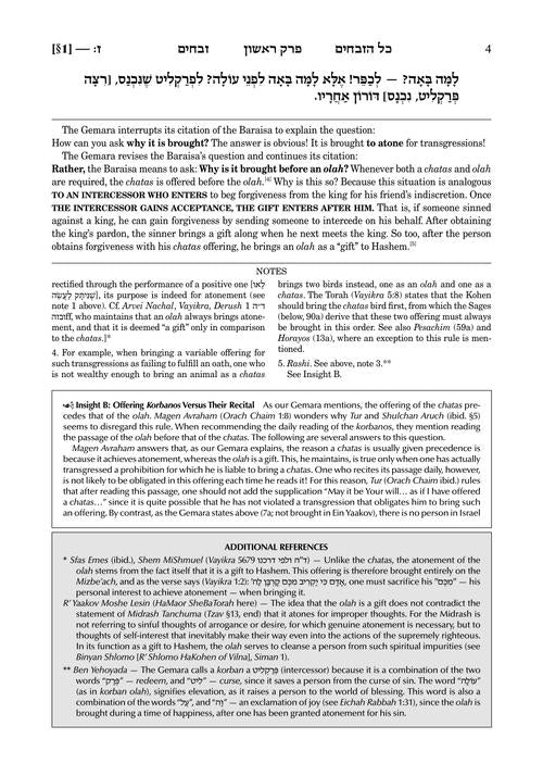 "Insights": This special feature illuminates various points in the text and brings out the many lessons and principles that are relevant in our daily lives. These Insights are drawn from a vast literature of various commentaries and Torah works, ranging from the Rishonim to the masters of Chassidus and Mussar.