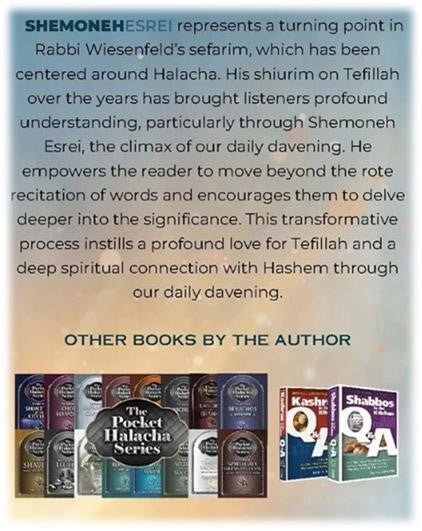 Shemoneh Esrei represents a turning point in Rabbi Wiesenfeld’s sefarim, which has been centered around Halacha. His shiurim on Tefillah over the years has brought listeners profound understanding, particularly through Shemoneh Esrei, the climax of our daily davening. He empowers the reader to move beyond the rote recitation of words and encourages them to delve deeper into the significance. This transformative process instills a profound love for Tefillah and a deep spiritual connection with Hashem through our daily davening.