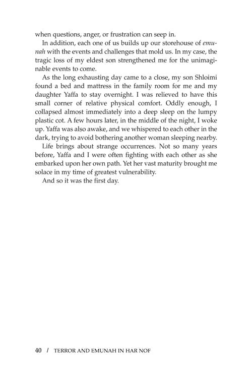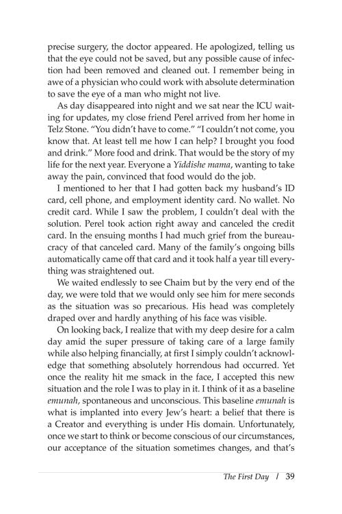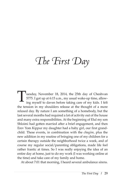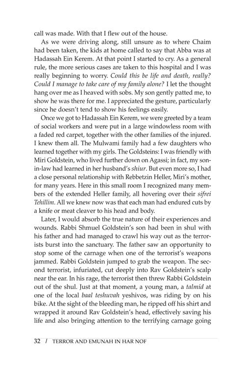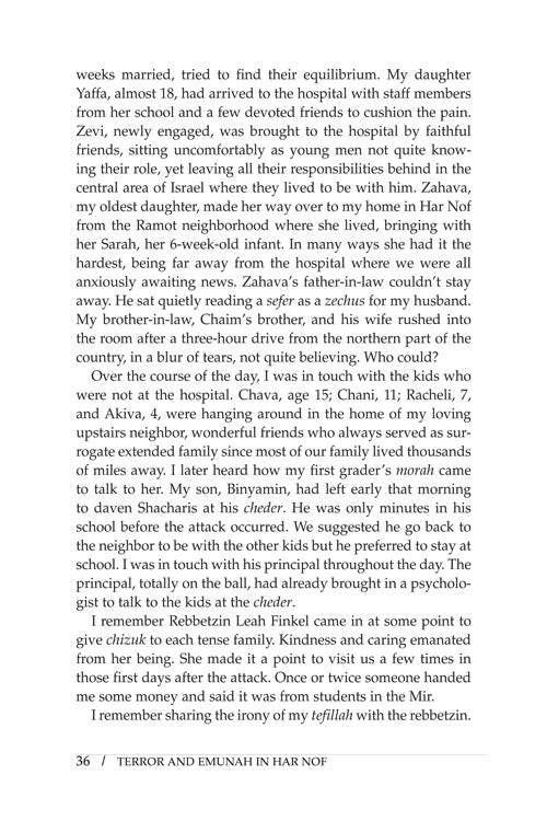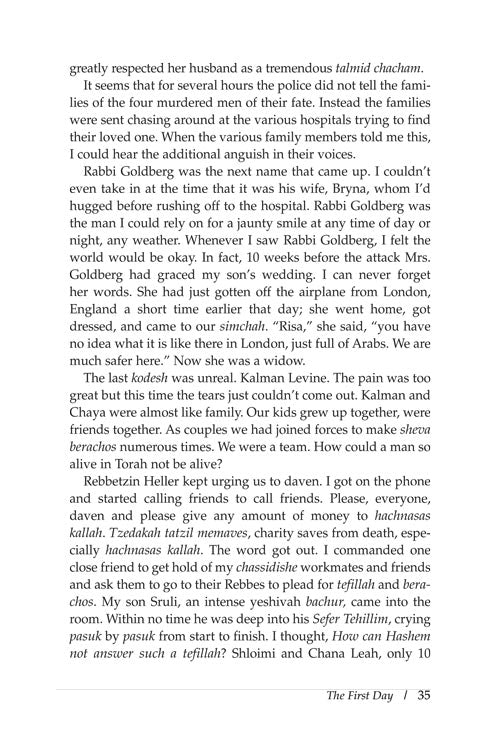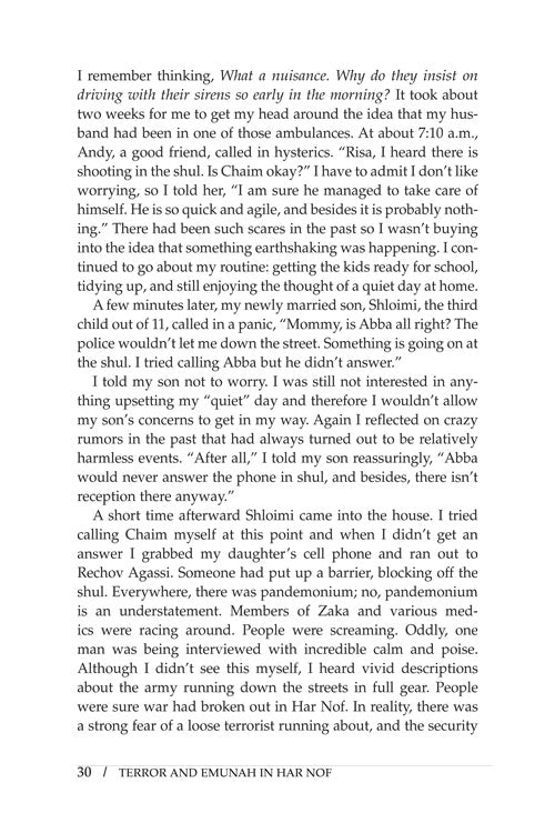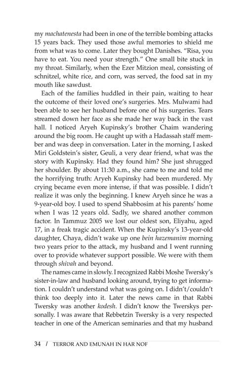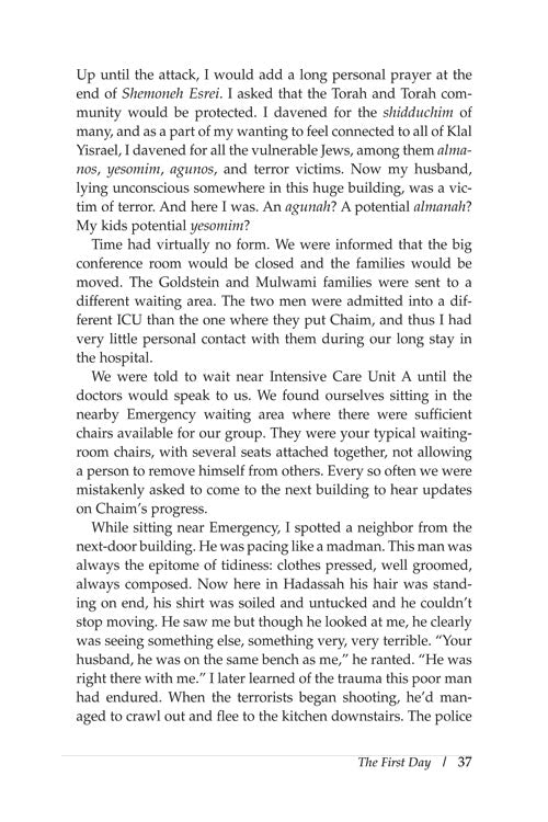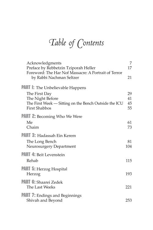 Struggle. Growth. Terror. Compassion. Suffering. Tears. Faith. It was a long, long year.... For days, the headlines screamed about the unprecedented attack. Terror, unfortunately, had become all too common, but to invade a peaceful synagogue, to brutally use guns to shoot men clad in tallis and tefilin, to use a meat cleaver against men quietly pouring their hearts out to their Creator - what became known as the Har Nof Massacre was a new level of violence that shocked the world. And then, as always, new headlines replaced the old. The world moved on, and the widows and orphans, the bereaved parents, the families and neighbors and friends, were left to remember and to mourn. For Risa Rotman and her family, the grieving took a very different form. Her husband, Chaim, who'd been left with serious brain injuries, was in a deep coma. Not dead, but somewhere far, far away. Terror and Emunah in Har Nof is Risa's story, told in her own words, with honesty, insight, and yes, even humor. In hospitals, rehab facilities, ambulances and her own home, we're with her as she draws upon deep wellsprings of emunah (and chocolate ice cream!) to grapple with her unimaginable challenges. Though it begins with terror and ends with sorrow, Terror and Emunah in Har Nof is not a sad book. It's a book that shows us the strength of our people's compassion, and how, as Risa tells us, “ "A Jew is never in limbo... they are exactly in the place they are meant to be."”