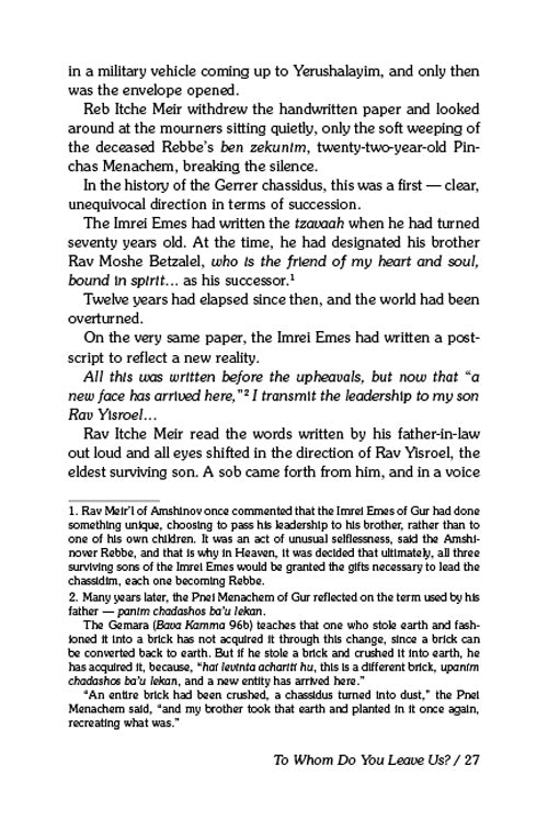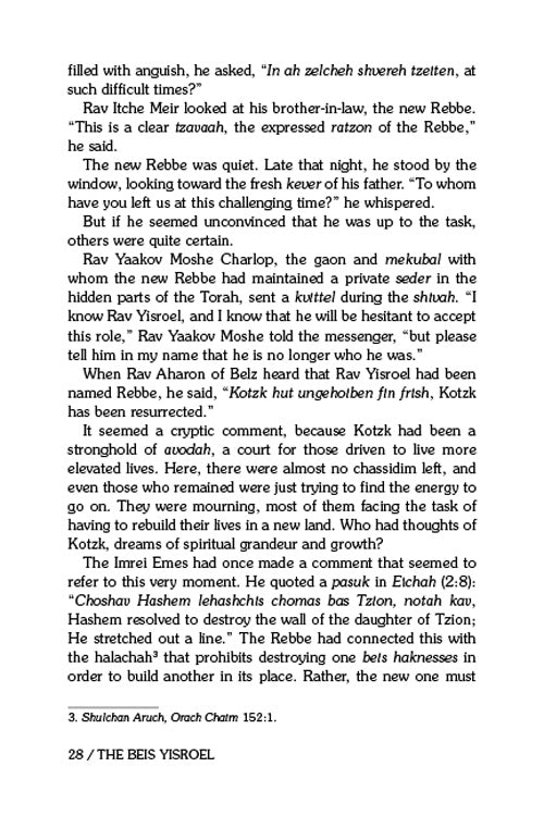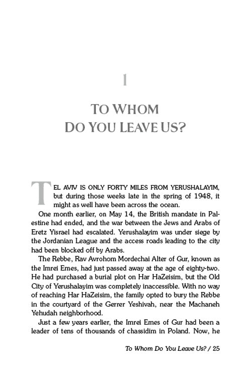 Written with the flair and emotion that have made Yisroel Besser’s biographies so beloved, The Beis Yisroel tells both stories -- the story of the Rebbe’s immeasurable impact on a nation still reeling, and the individual stories of how he was able to heal, encourage and uplift. From a sign painter to his beloved talmidim, from survivors whose horrific experiences had sent them far from their chassidic routes to bachurim struggling with the lures of secular society – whatever the challenges, the Rebbe was there to help and guide and find the greatness of every Jew.