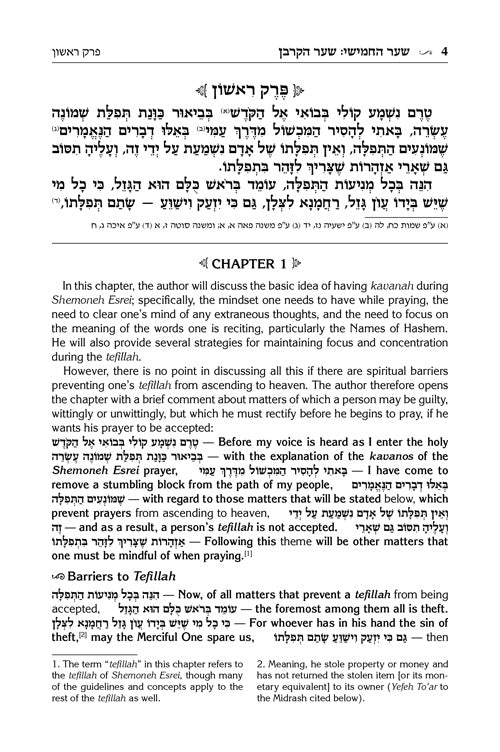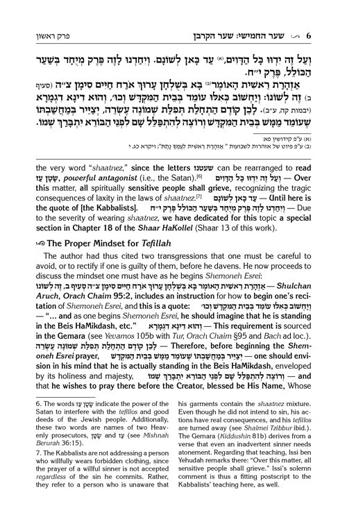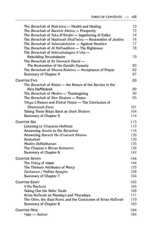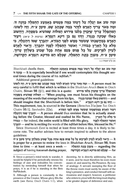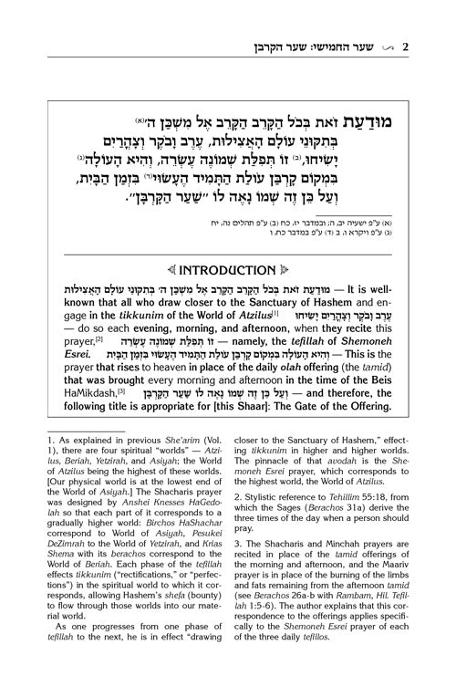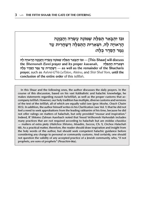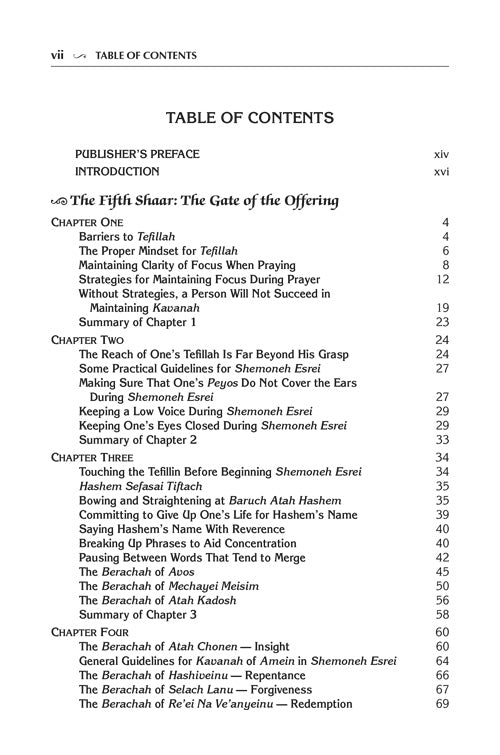 Shaar 5 — The Gate of the Offering: Inspirational thoughts to enhance our Shemoneh Esrei and the conclusion of Shacharis, as well as halachos and minhagim pertaining to those parts of the davening and Krias HaTorah.