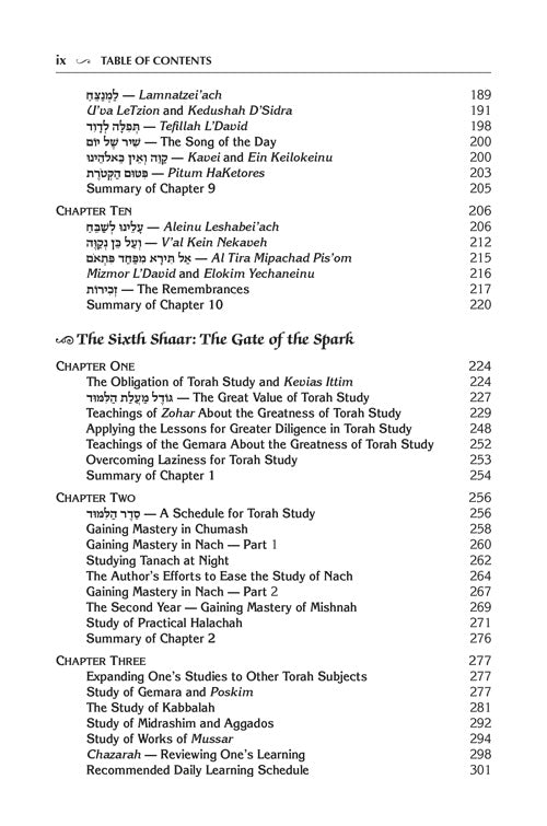 Shaar 6 — The Gate of the Spark: An exposition of the tremendous value of Torah study, a program for mastering all areas of Torah, and kavanos to be pondered before learning each area of Torah.