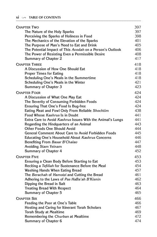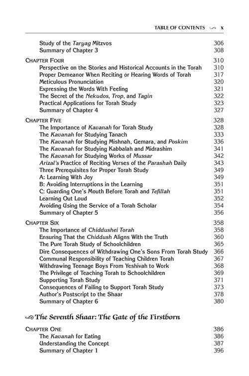 Shaar 7 — The Gate of the Firstborn: How to serve Hashem through one’s eating (based on the teachings of Arizal), a related discussion delineating a proper approach to enjoying worldly pleasures, kavanos for Bircas HaMazon, and inspirational thoughts to enhance our prayers of Minchah, Maariv, and the Bedtime Krias Shema.