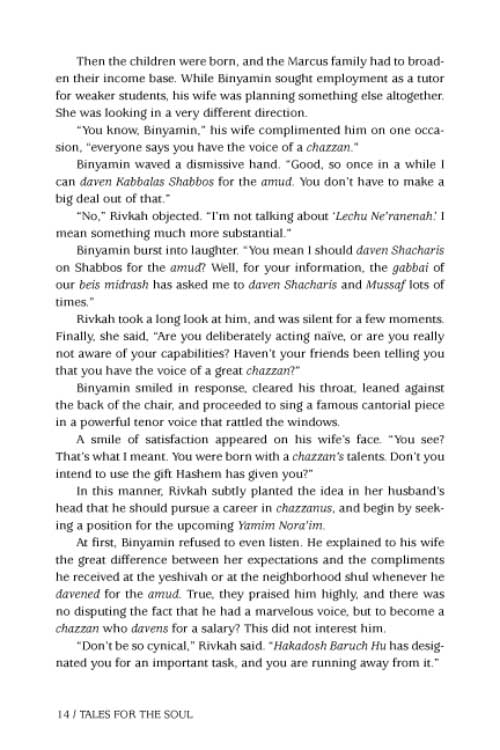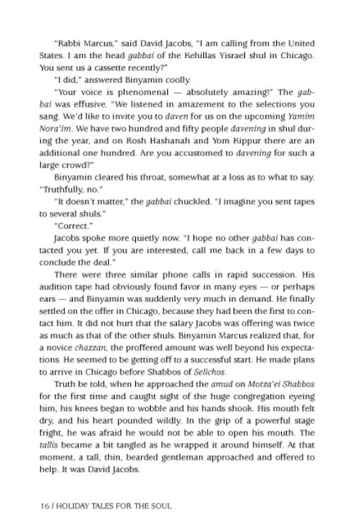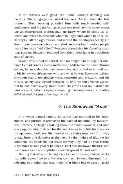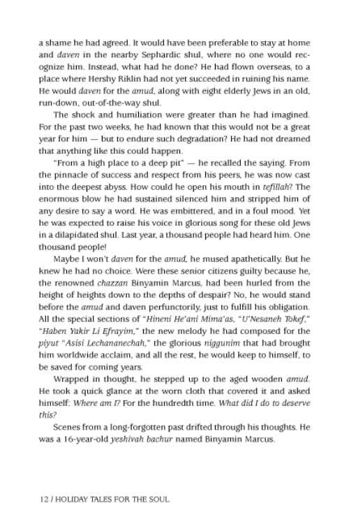 These are stories with messages, stories that reach for higher realms and take the reader with them. The author comes from a Chassidic background and he is a student of Brisk - a combination that provides a unique blend of passion and incisiveness that makes reading this book an even more enriching experience. This is a book that captures the wealth of our heritage. It is an enchanting read - not only on holidays but all year round!