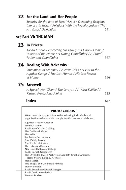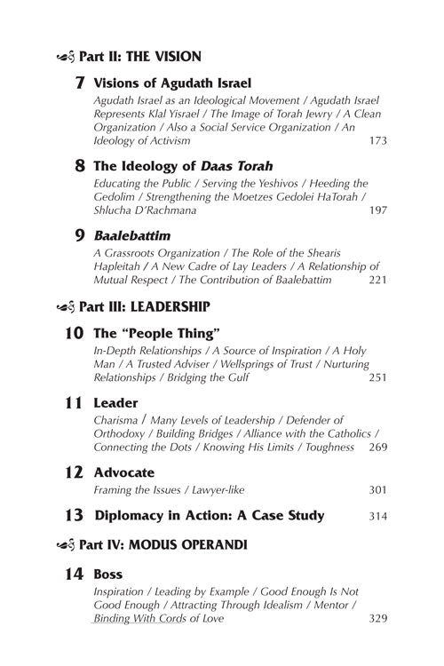 Rabbi Sherer was at home in many worlds. He was the loyal servant and confidant of great Torah sages; and a friend and adviser of people in the highest echelons of power - but he was attentive to the needs of the humblest "Reb Yisrael." He was a visionary, yet he had insight into the art of the possible. He had an uncanny ability to recognize and mold young people with potential. His life was Agudath Israel, but he was available to all. He was center stage, yet remained an intensely private, loving family man. He was an eloquent orator and writer, and this book is replete with selections from his vast repertoire of Torah thoughts and anecdotes.