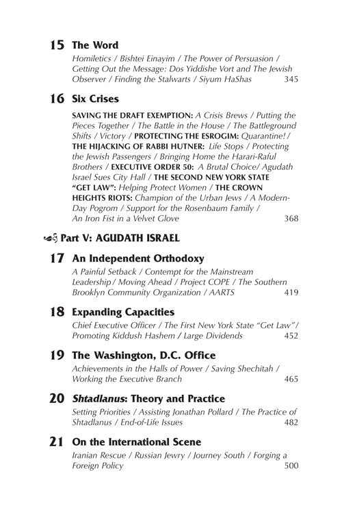 Rabbi Yonoson Rosenblum's magnificent biography draws on Rabbi Sherer's vast inventory of aides-mיmoire and correspondence. He takes us inside the public and private Rabbi Sherer. We meet those who inspired him and shaped him: his mother and rebbeim; his mentor in Klal work, R' Elimelech Gavriel Tress; Rabbi Aharon Kotler and two generations of gedolei hador. We get an inside look at governors, mayors, and legislators — even Presidents — at the legal battles to protect Torah life and the secret activity to rescue Jews in danger.