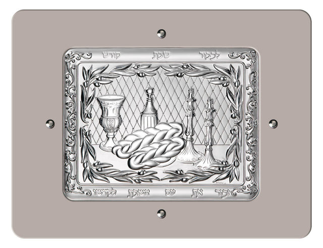 The base of this magnificent Challah board is a smart beige colour, combined with a rectangular silver insert with an embossed Shabbat scene.