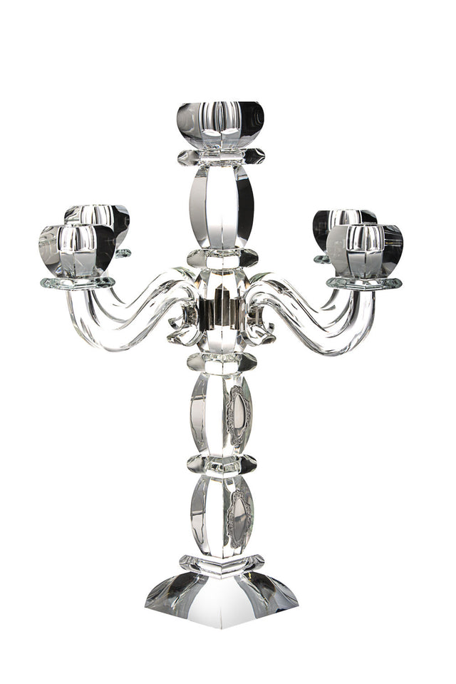 Crystal five branch candelabra, decorated with a modern plain effect design to enhance the special Mitzvah of candle lighting.