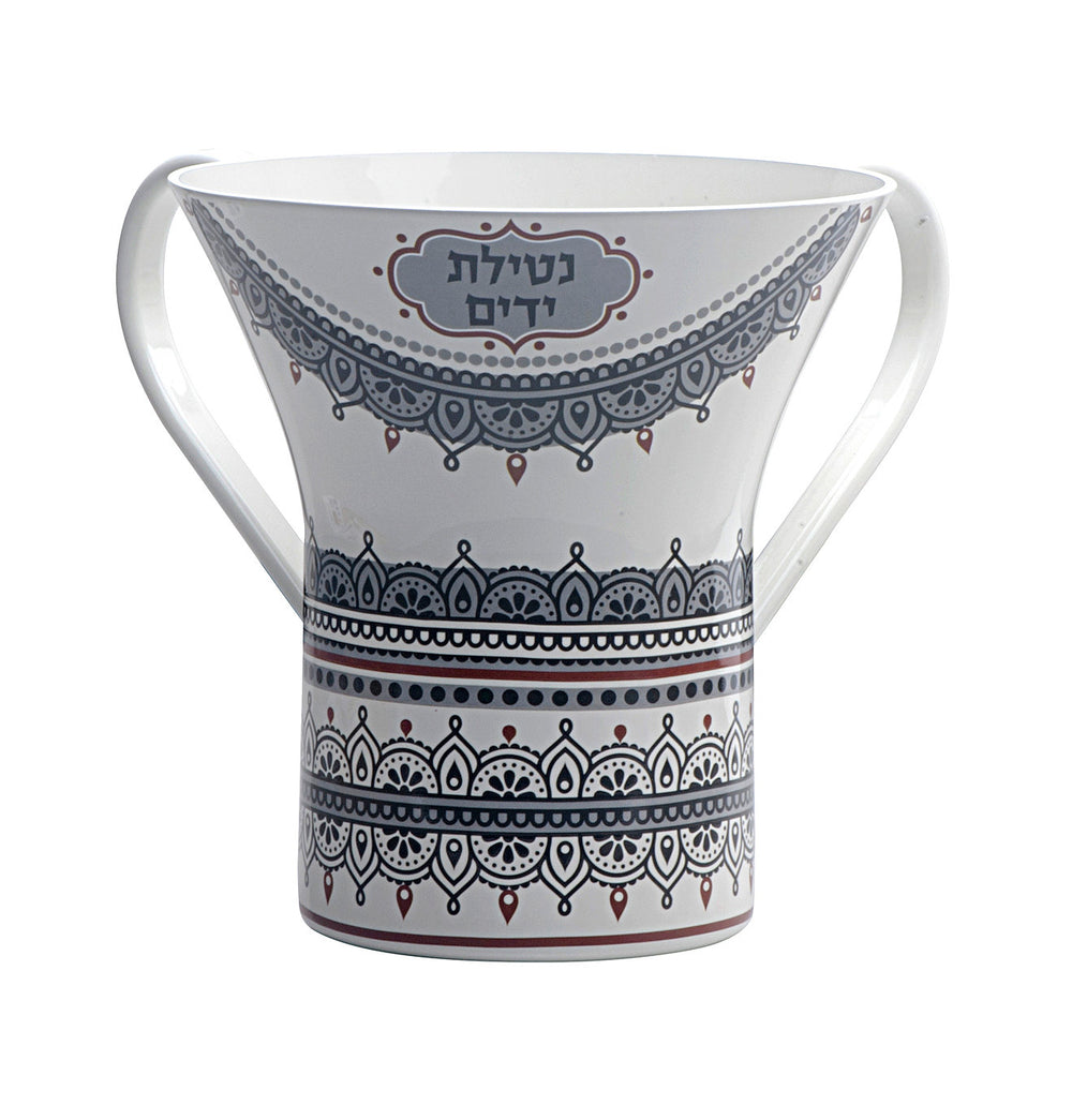A washing cup, for the Mitzvah of washing hands before eating bread. The cup is made of aluminum, with traditional henna decorations printed in solid elegant tones and the words "Netilat Yadayim" in Hebrew. It does not rust, it’s lightweight and pleasant to use. The washing cup will decorate every area of washing hands in the kitchen or bathrooms. It can be combined with the matching hand towel for a coordinated look.