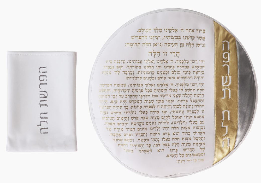 Dough Cover with Brachot & Tefillot for Hafrashat Challah with Holder-PU- Gold/White 40.6cm
