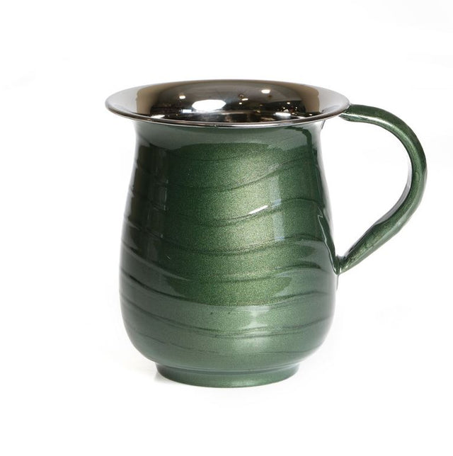An elegant stainless steel washing cup, with a unique wave design in green.